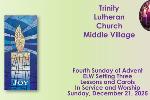 Advent – Sundays at 10:30 AM Lessons and Carols on 12/21/2026 at 10:30AM – Followed by Potluck Party Christmas Eve: Cookie Social at 6:00 PM. Candlelight Service at 7:30 PM Christmas Day Worship Service at 10:30 AM